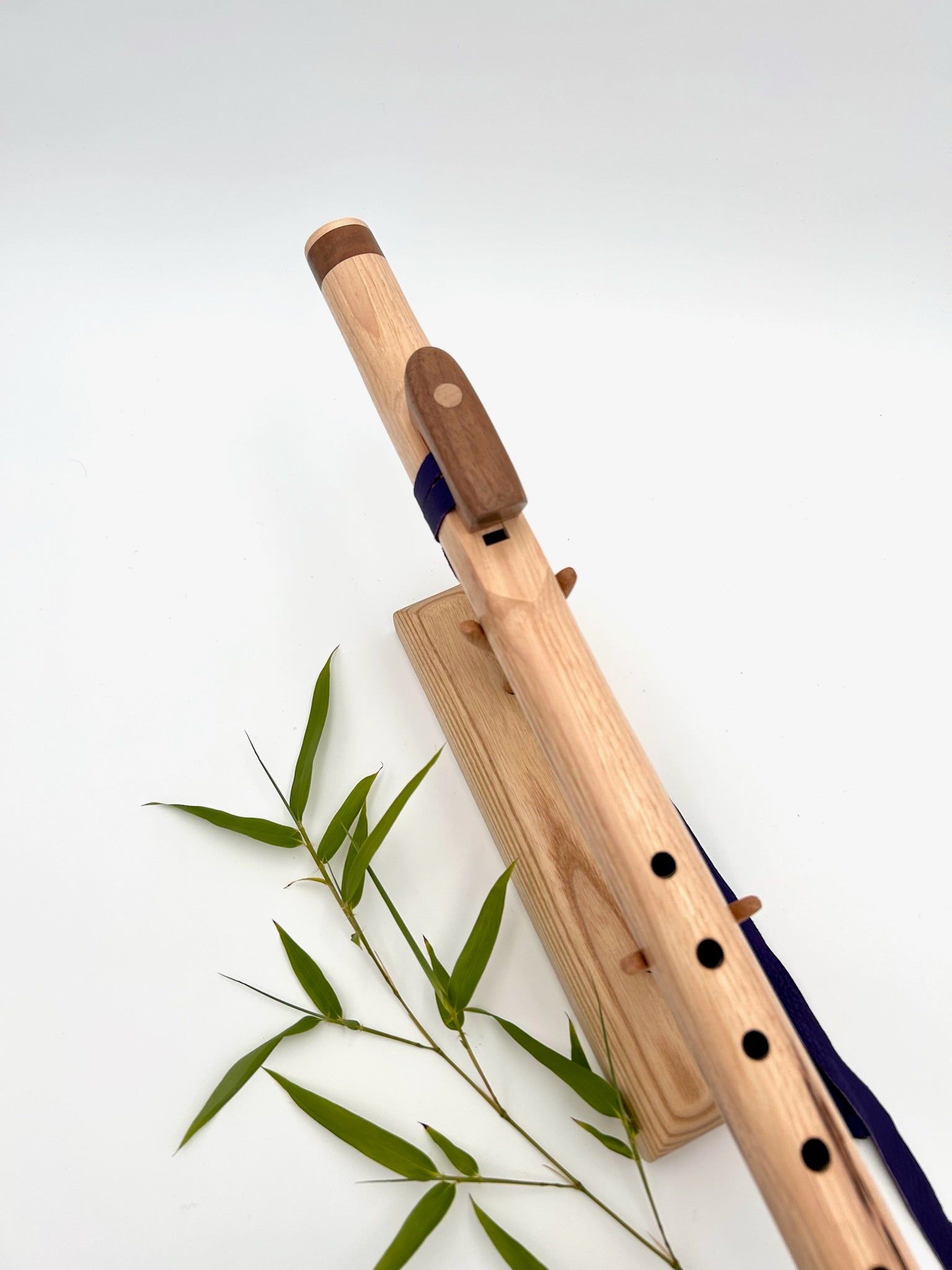 The body is Hickory with Walnut accents and a special maple wood inlay on the fetish. This is a great flute for those who love that deep tone and can work with a mid to far finger spread. Simple, sturdy and ready to play anywhere!